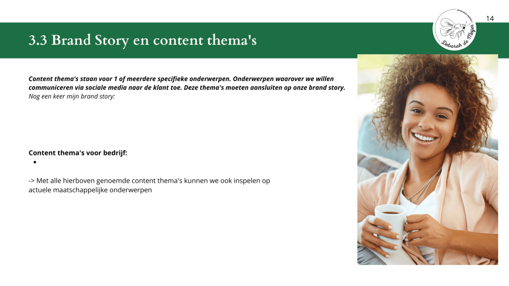 - Duidelijke actiepunten, veel inspiratie, tips en praktische handvatten voor al jouw content (of om een duidelijke briefing te kunnen meegeven aan externe partijen);