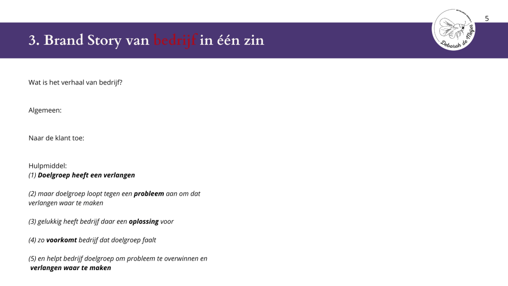 Tijdens sessie 2 gaan we verder met het invullen van alle brand story-elementen voor jouw merkverhaal. Hiervoor geef ik je uiteraard nogmaals uitleg, inspiratie en voorbeelden uit de praktijk en help ik je met het vinden van de juiste woorden. Vervolgens maken we van alle ingevulde elementen een lopend verhaal, in één zin. Zo heb jij altijd jouw elevator pitch klaar.